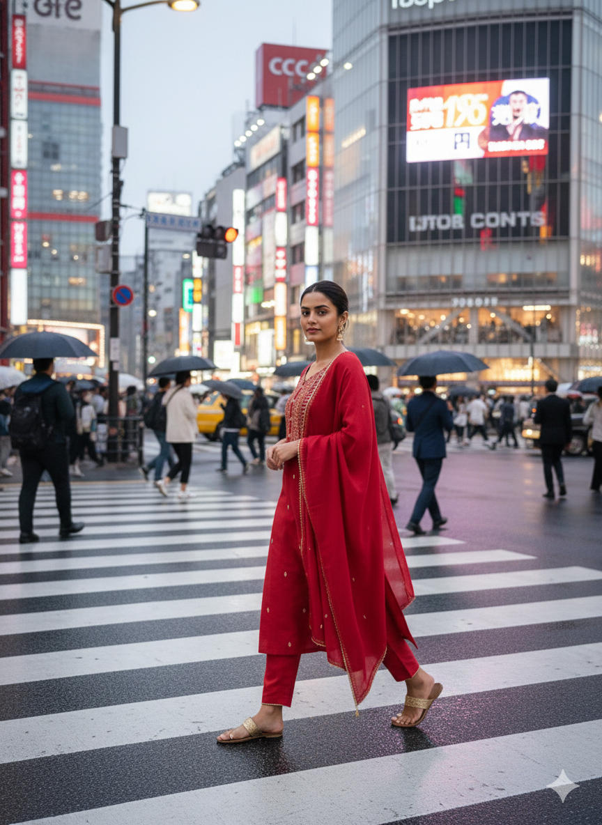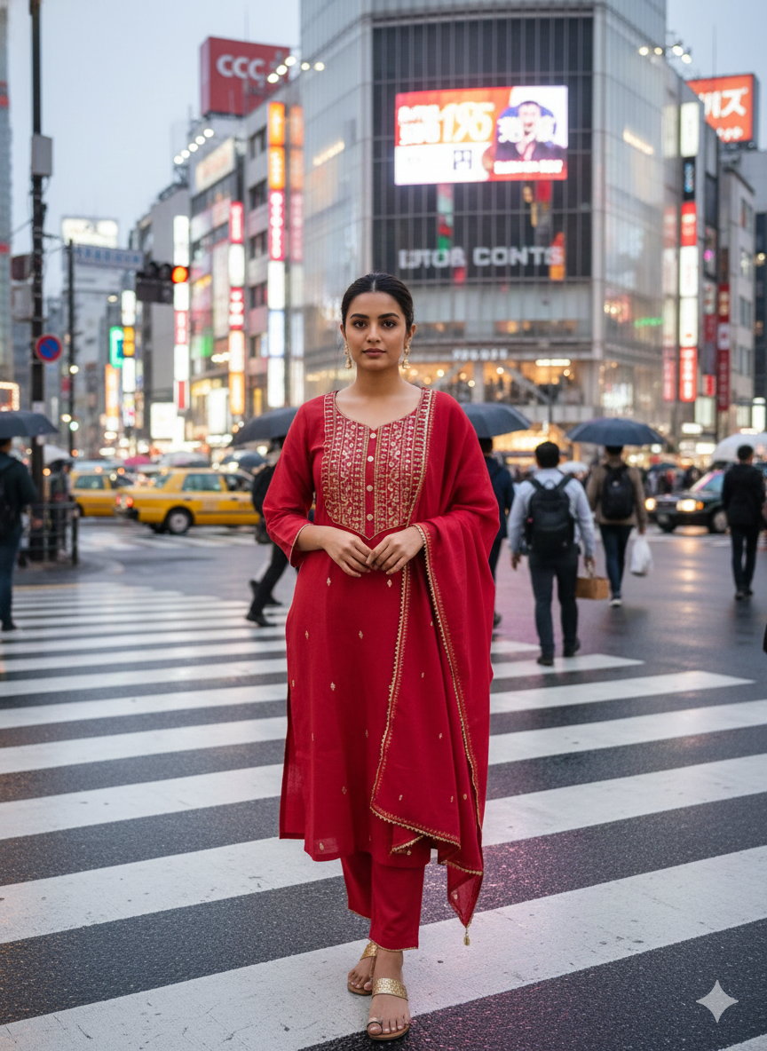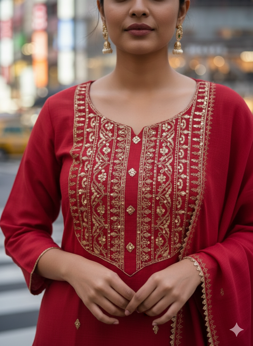 Draped in serene elegance, this outfit reflects a perfect balance of tradition and calm sophistication. The rich hue radiates warmth, while the delicate embroidery flows like a quiet rhythm, creating a sense of mindful beauty. Every detail feels intentional, from the graceful silhouette to the soft textures that move effortlessly with you. It’s a look that invites stillness in motion—where comfort meets refined style. Rooted in tradition yet breathing modern ease, this ensemble is made for moments when you want to feel grounded, confident, and gracefully present, letting your style speak softly, yet leave a lasting impression.