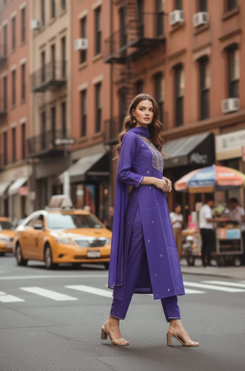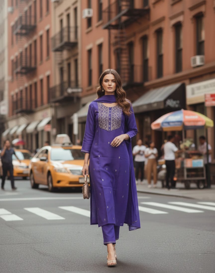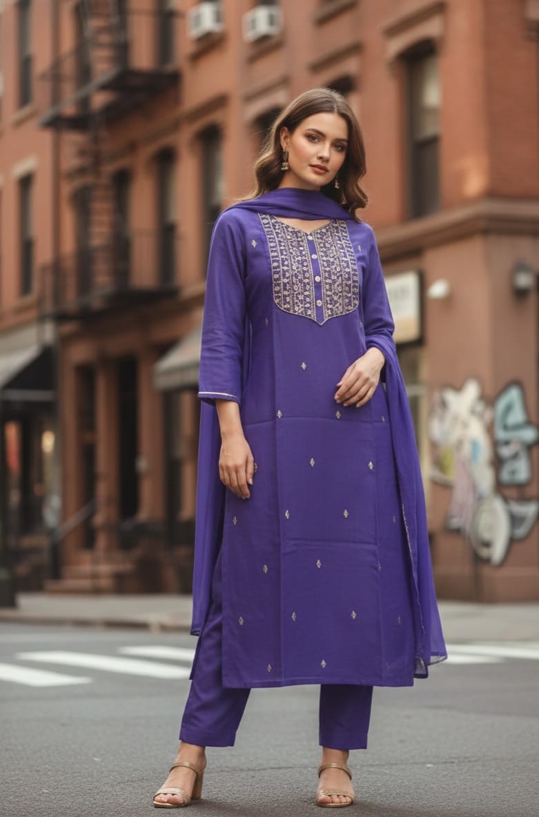 Step into timeless elegance with this beautifully designed Panghat Collection kurta set. Crafted in premium biscuits slub fabric, this purple A-line kurta features exquisite ethnic embroidery that reflects traditional artistry. Paired with matching pants and a soft cotton dupatta, the ensemble offers both comfort and refined style. The notch neckline and three-quarter sleeves add a modern touch, while the calf-length silhouette ensures graceful movement. Perfect for parties and special gatherings, this embroidered kurta set blends classic charm with contemporary fashion, making it a must-have addition to your ethnic wardrobe.