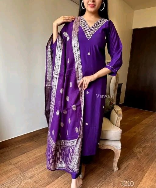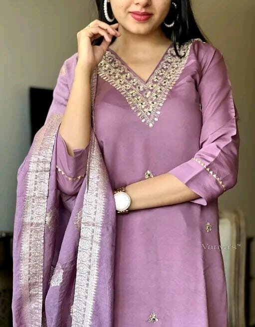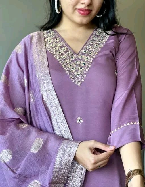 The rich violet fabric is enhanced with intricate golden embroidery along the V-shaped neckline, featuring delicate floral motifs arranged in a symmetrical pattern. Fine detailing continues along the border of the dupatta and sleeves, adding a luxurious, handcrafted feel. The soft sheen of the fabric complements the ornate threadwork, creating a perfect balance between sophistication and grace. Ideal for festive occasions or special gatherings, this outfit reflects timeless style with a modern, refined touch.